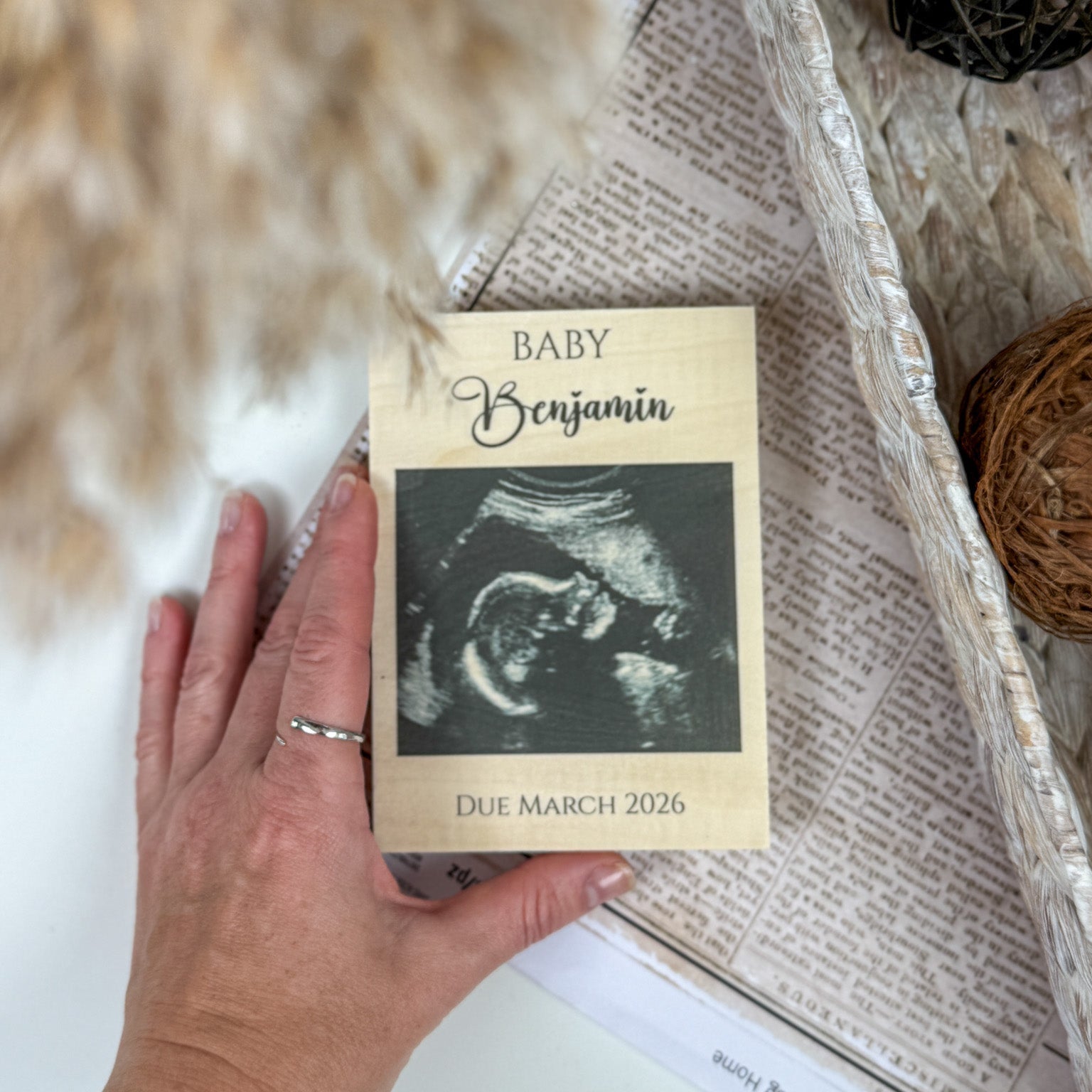 Each plaque is printed on high-quality natural wood, giving it a timeless, rustic charm. Add your baby’s name, due date, or a short message for a truly personalized keepsake.