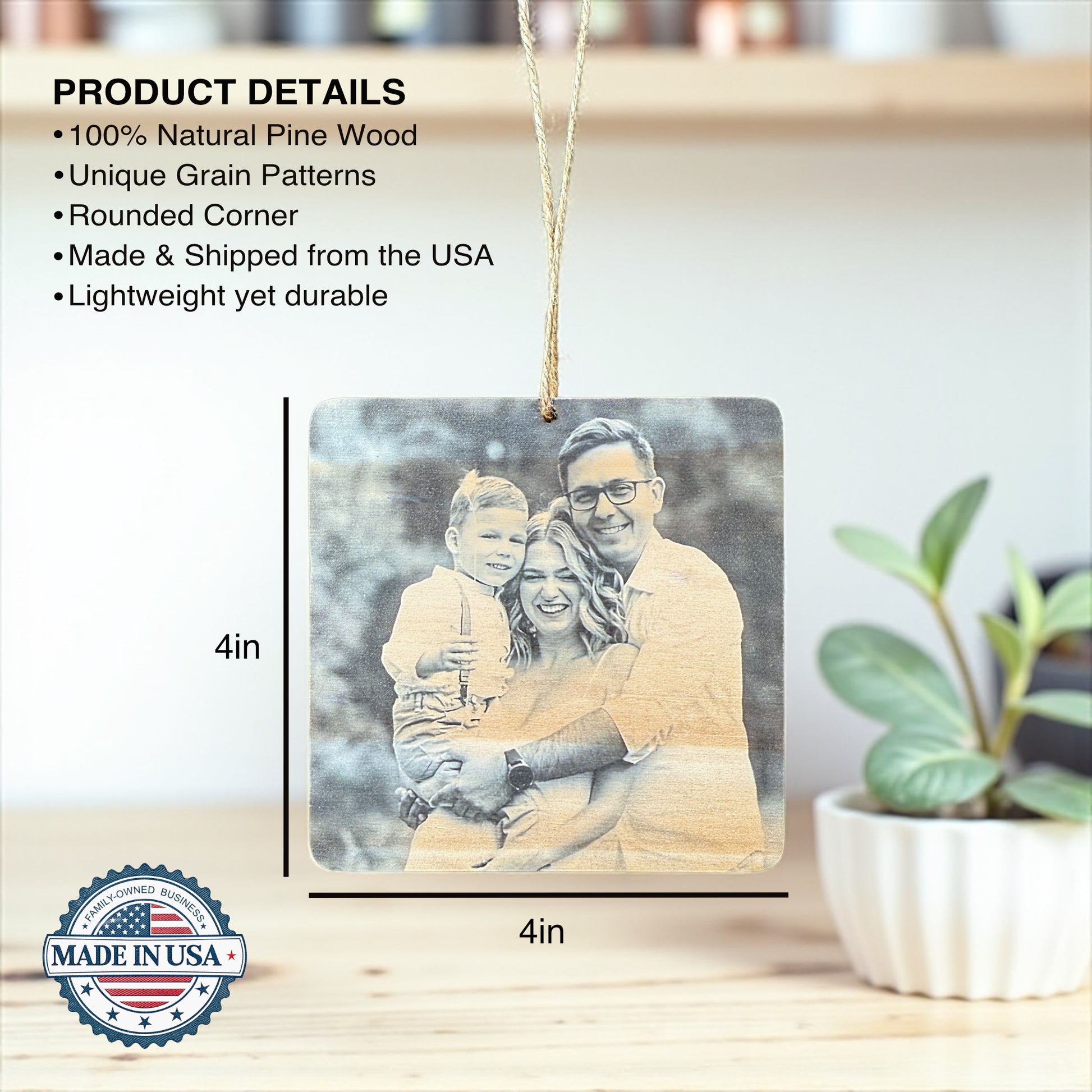 Photos are printed on a high quality natural wood slice 4″x4″ in size. Comes with twine for hanging.