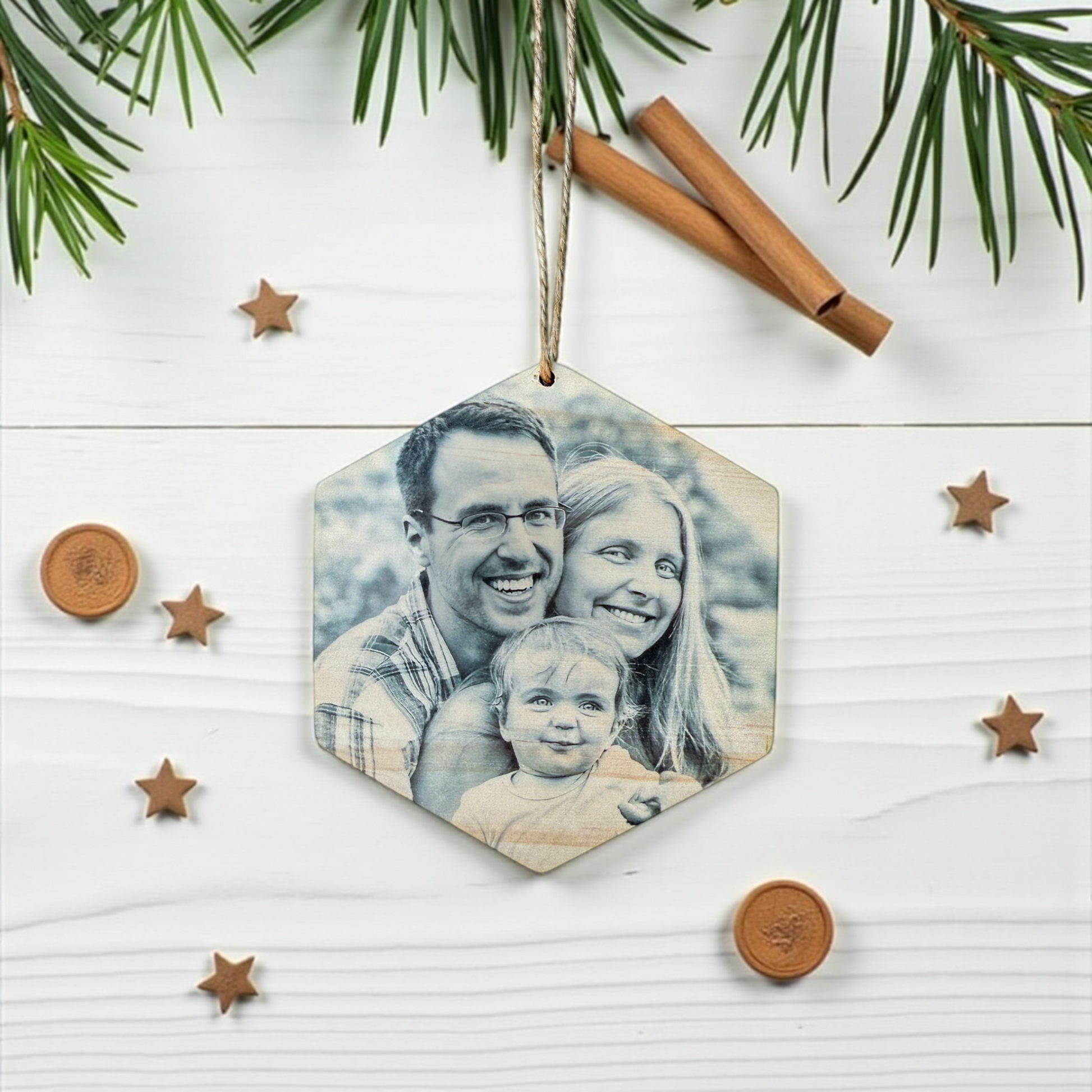 Capture a special moment and turn it into a timeless keepsake with our Custom Wood Hexagon Photo Ornament. Whether you're commemorating a first Christmas, celebrating love, honoring a memory, or simply adding a personal touch to your tree, this ornament is the perfect way to keep that moment close every season.